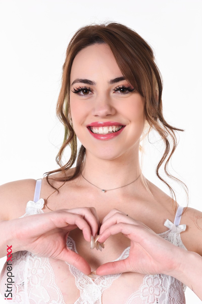 The captivating "It's Bedtime" striptease scene unfolds as Abby Margarita, in her playful allure, initially poses in delicate white lingerie and then teases the audience, as she offers a sweet heart-shaped gesture with her hands. She continues to charm in the scene with her radiant smile and playful expressions as she undresses.