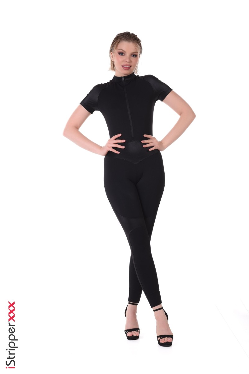 This "Unzip Exposure" scene begins with Ashby Winter in a full body black jumpsuit. This jumpsuit is slowly unzipped, exposing more of her body as the scene progresses to provide a tease to viewers.