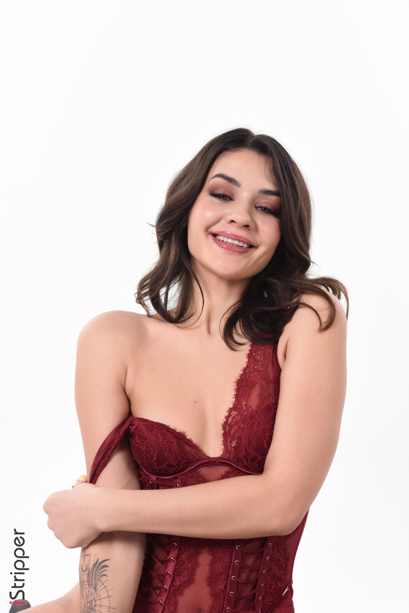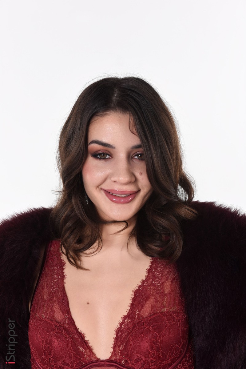 Welcome to the 'Luxurious Seducing' scene where Esteria captivates with her elegant, dark fur coat and alluring red lace outfit. She beams with a seductive smile, hinting at the exciting performance to come as she prepares to undress gracefully for you.