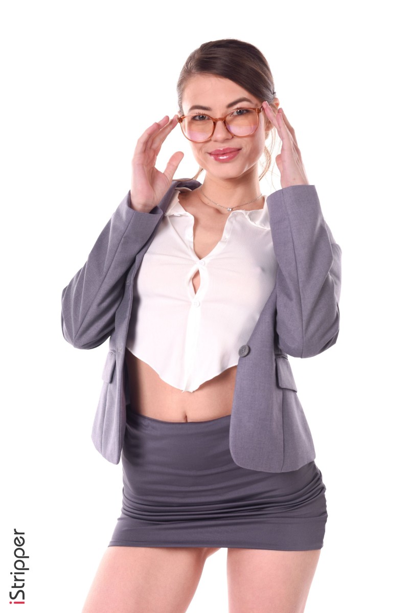 Hilary C. is dressed as a young businesswoman, with a skirt suit and a white dress shirt and she is wearing glasses to complete the look! In "It's Business Time", she seductively removes her blazer, then loosens her white dress shirt to show her toned midriff.