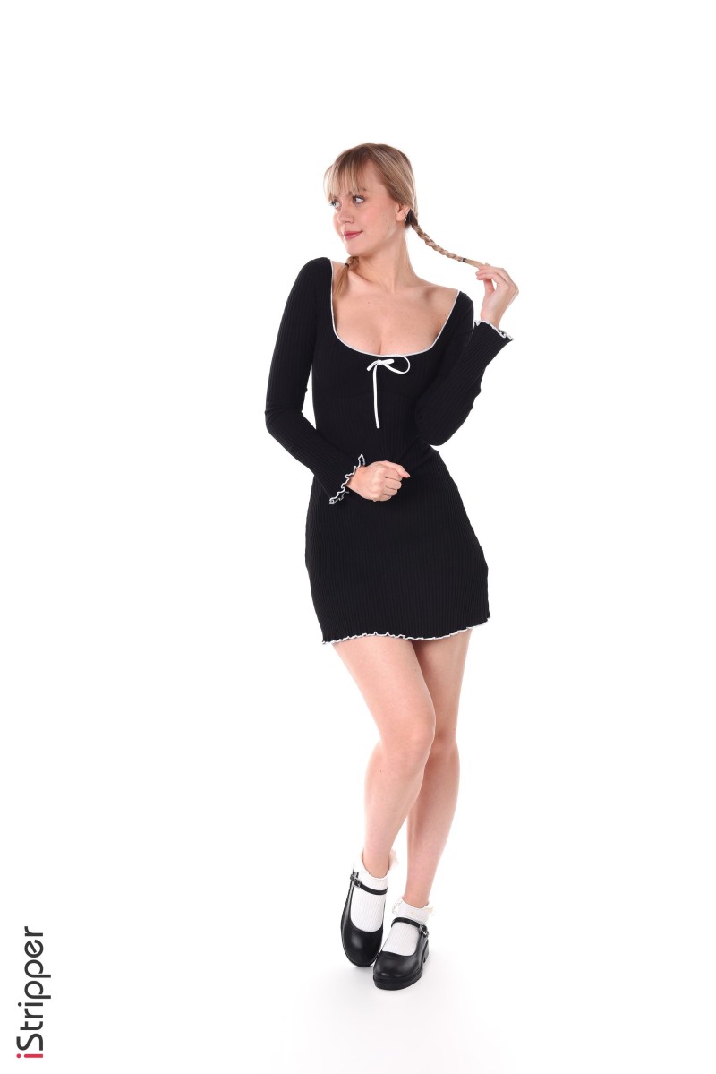In "Lovely Ingenuous", Lana Lane is stripping for us. She is playing and posing with her hair wearing a black dress while slowly revealing her naked body for us to admire.