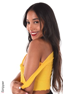 Oh my god, get ready! In "Little Ray of Sunshine" Linda Baker is teasing the audience with a black mini skirt with a side slit and a yellow crop top that shows off her toned abs as she strikes playful poses. It's a tantalizing dance of anticipation, where every movement hints at the steamy fun about to unfold as she prepares to shed her clothes.