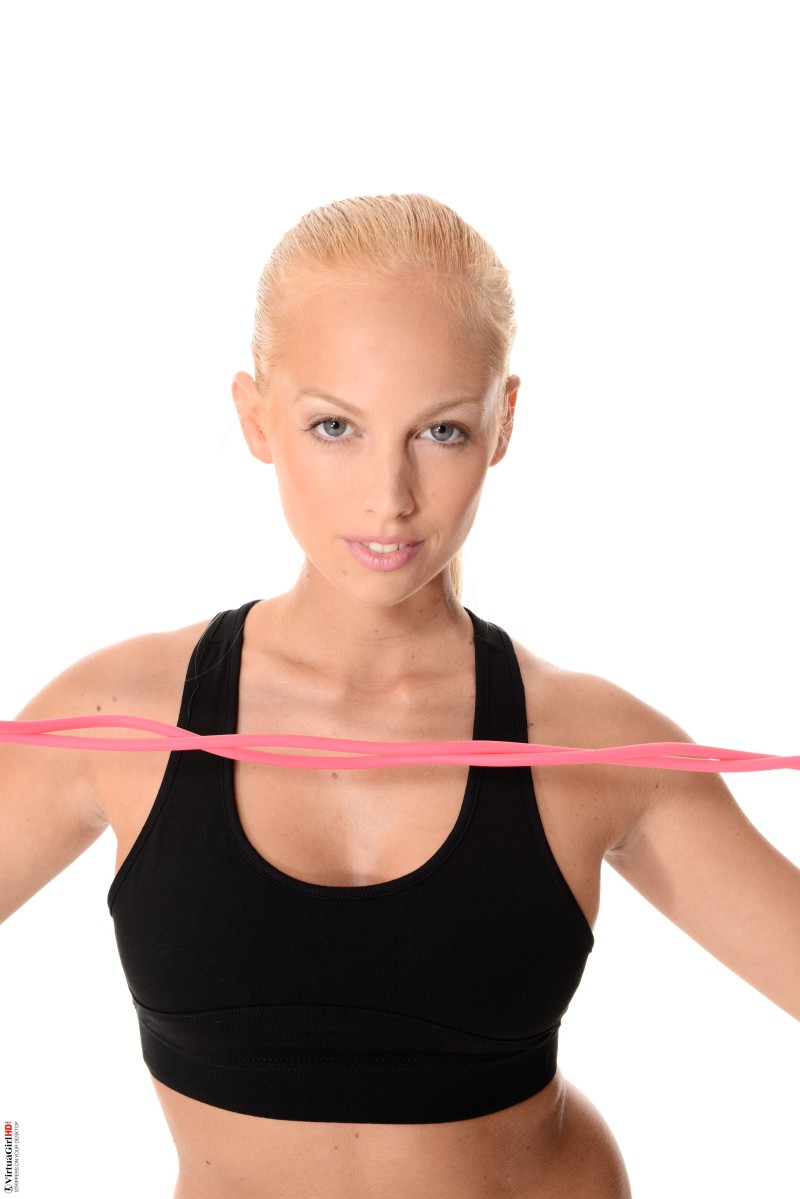 Get ready for the hottest workout ever with Melody Powers in "Kick Boxer"! This blonde bombshell starts out wearing a sporty black top and shorts with red boxing wraps. She stretches and poses, showing off her incredible body. As the scene heats up, Melody grabs a pink resistance band, giving you a tantalizing glimpse of her toned physique. Then, with a playful grin, she slowly lifts her top, revealing her gorgeous breasts. She lowers herself to her knees, giving you a full view of her stunning figure and inviting you to join her for a private workout session you'll never forget!