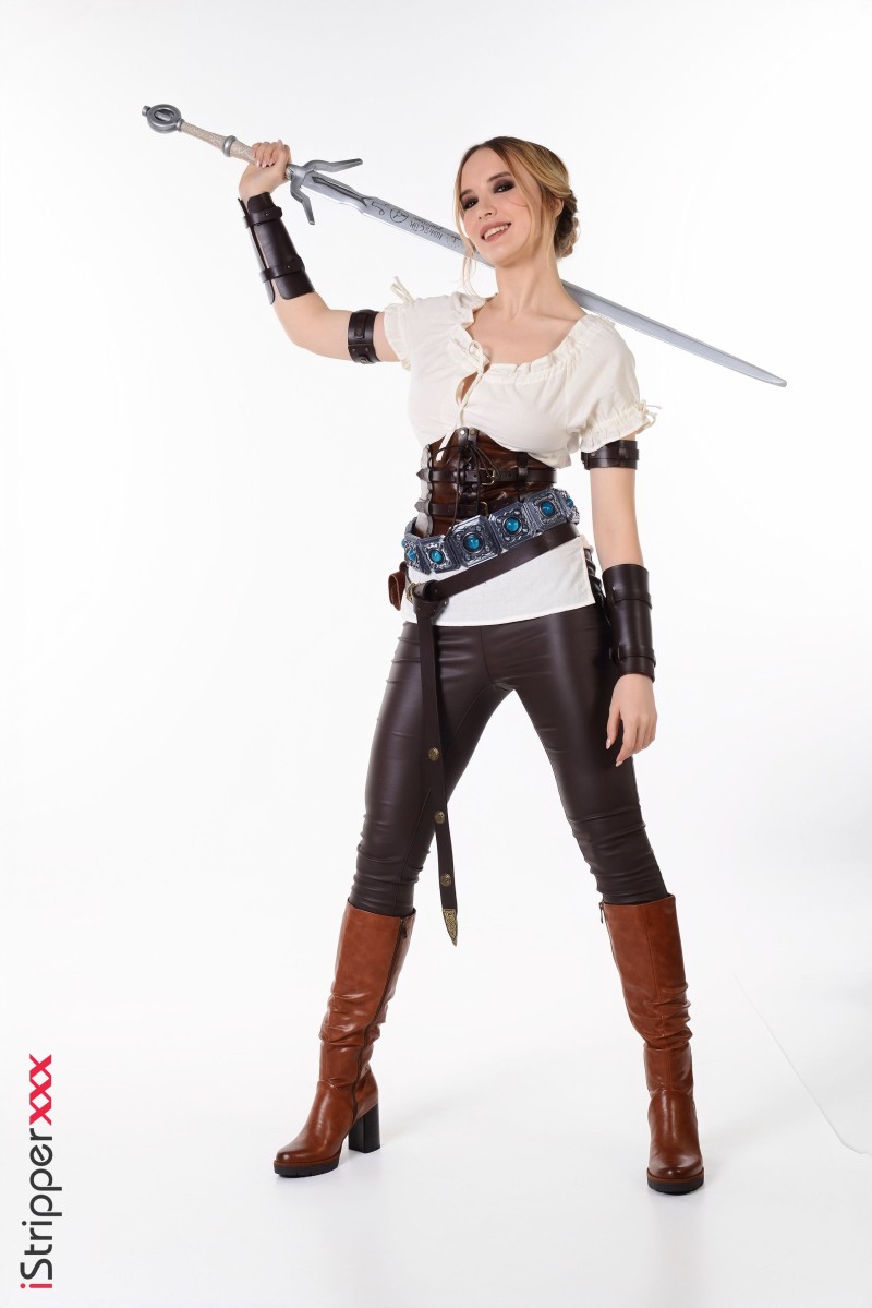 The scene "The Wild Cunt" shows Polly Yangs dressed in tight brown leather pants, a white blouse, a brown corset and brown leather boots, she holds a big sword in her hands like a warrior. Polly Yangs looks very good and her whole outfit, including her pose, makes the scene absolutely perfect and hot.