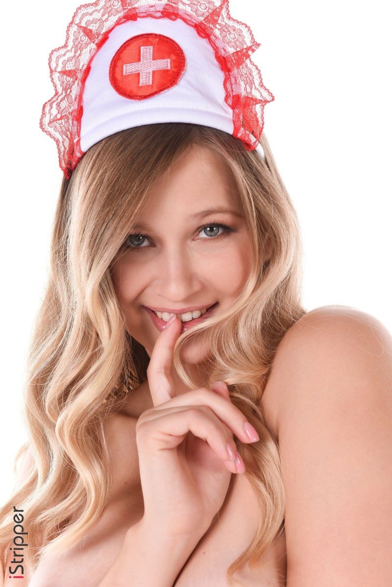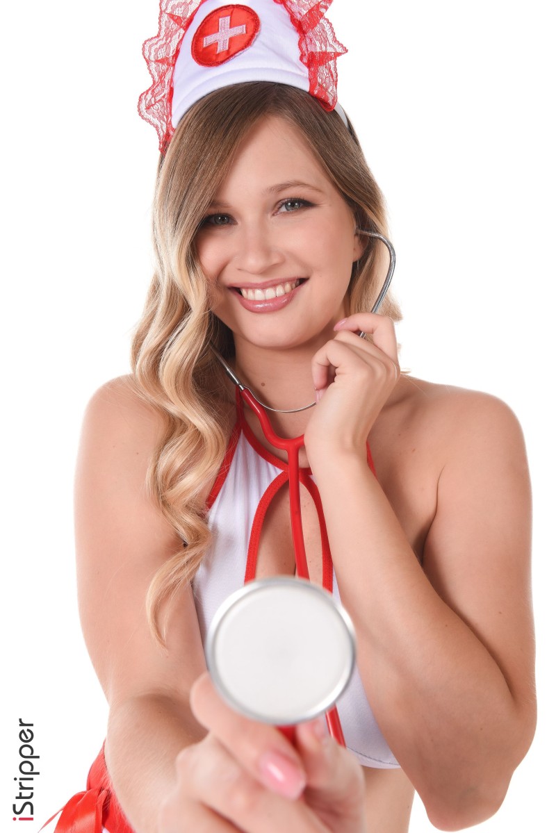 I see a blonde stripper named Stella Cardo who is a nurse and is in a striptease. In "Listen to My Heart Beat," Stella is wearing a red and white nurse outfit as she temptingly teases the viewer.