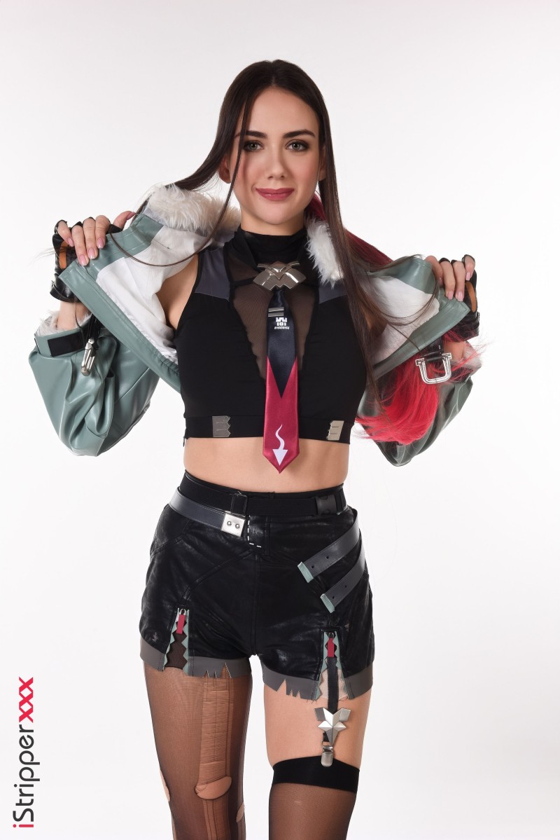 Oh wow, get ready to see an amazing performance in the "Solo" striptease scene! Vixi Rafi is wearing a jacket, shorts, and platform heels, and she is about to take it off for your viewing pleasure.